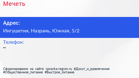 Мечеть по адресу Ингушетия, Назрань, Южная, 5/2 в дальнейшем Организация, размещена в следующих категориях: