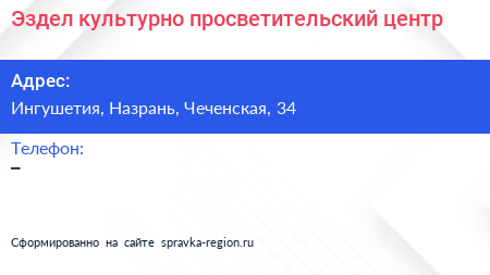 Эздел, культурно-просветительский центр по адресу Ингушетия, Назрань, Чеченская, 34 в дальнейшем Организация, размещена в следующих категориях: