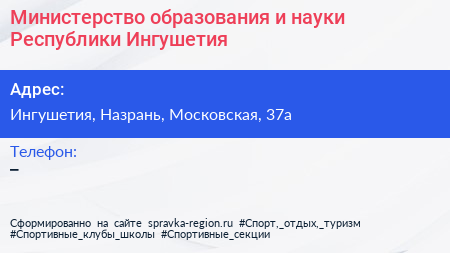 Министерство образования и науки Республики Ингушетия по адресу Ингушетия, Назрань, Московская, 37а в дальнейшем Организация, размещена в следующих категориях: