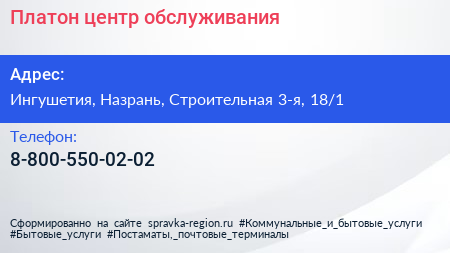 Платон, центр обслуживания по адресу Ингушетия, Назрань, Строительная 3-я, 18/1 в дальнейшем Организация, размещена в следующих категориях: