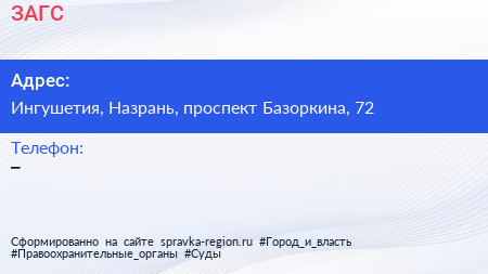 ЗАГС по адресу Ингушетия, Назрань, проспект Базоркина, 72 в дальнейшем Организация, размещена в следующих категориях: