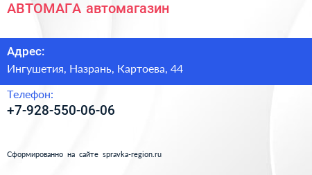 АВТОМАГА, автомагазин по адресу Ингушетия, Назрань, Картоева, 44 в дальнейшем Организация, размещена в следующих категориях: