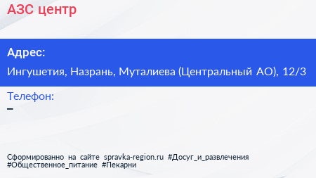 АЗС-центр по адресу Ингушетия, Назрань, Муталиева (Центральный АО), 12/3 в дальнейшем Организация, размещена в следующих категориях: