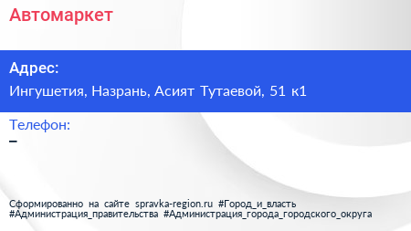 Автомаркет по адресу Ингушетия, Назрань, Асият Тутаевой, 51 к1 в дальнейшем Организация, размещена в следующих категориях: