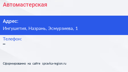 Автомастерская по адресу Ингушетия, Назрань, Эсмурзиева, 1 в дальнейшем Организация, размещена в следующих категориях: