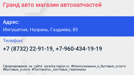 Гранд авто, магазин автозапчастей по адресу Ингушетия, Назрань, Газдиева, 85 в дальнейшем Организация, размещена в следующих категориях: