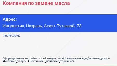 Компания по замене масла по адресу Ингушетия, Назрань, Асият Тутаевой, 73 в дальнейшем Организация, размещена в следующих категориях: