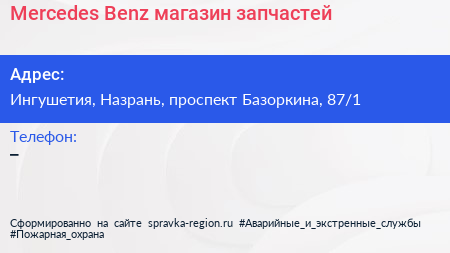 Mercedes-Benz, магазин запчастей по адресу Ингушетия, Назрань, проспект Базоркина, 87/1 в дальнейшем Организация, размещена в следующих категориях: