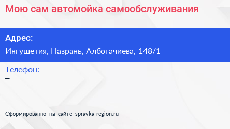 Мою сам, автомойка самообслуживания по адресу Ингушетия, Назрань, Албогачиева, 148/1 в дальнейшем Организация, размещена в следующих категориях:
