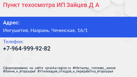 Пункт техосмотра, ИП Зайцев Д.А. по адресу Ингушетия, Назрань, Чеченская, 16/1 в дальнейшем Организация, размещена в следующих категориях: