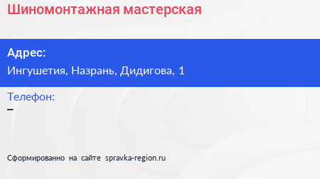 Шиномонтажная мастерская по адресу Ингушетия, Назрань, Дидигова, 1 в дальнейшем Организация, размещена в следующих категориях: