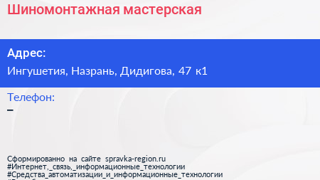 Шиномонтажная мастерская по адресу Ингушетия, Назрань, Дидигова, 47 к1 в дальнейшем Организация, размещена в следующих категориях:
