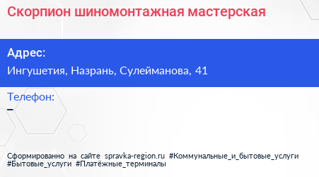 Скорпион, шиномонтажная мастерская по адресу Ингушетия, Назрань, Сулейманова, 41 в дальнейшем Организация, размещена в следующих категориях: