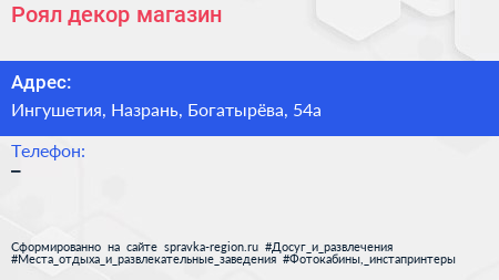 Роял декор, магазин по адресу Ингушетия, Назрань, Богатырёва, 54а в дальнейшем Организация, размещена в следующих категориях: