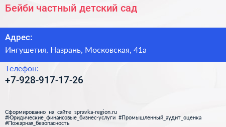 Бейби, частный детский сад по адресу Ингушетия, Назрань, Московская, 41а в дальнейшем Организация, размещена в следующих категориях: