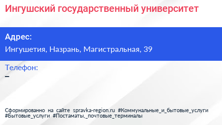 Ингушский государственный университет по адресу Ингушетия, Назрань, Магистральная, 39 в дальнейшем Организация, размещена в следующих категориях: