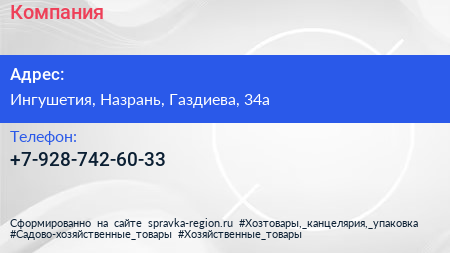 Компания по адресу Ингушетия, Назрань, Газдиева, 34а в дальнейшем Организация, размещена в следующих категориях: