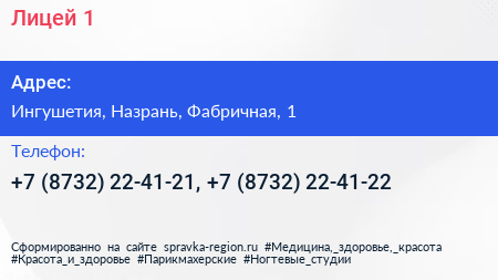 Лицей №1 по адресу Ингушетия, Назрань, Фабричная, 1 в дальнейшем Организация, размещена в следующих категориях: