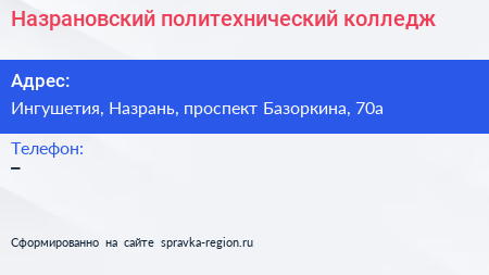 Назрановский политехнический колледж по адресу Ингушетия, Назрань, проспект Базоркина, 70а в дальнейшем Организация, размещена в следующих категориях: