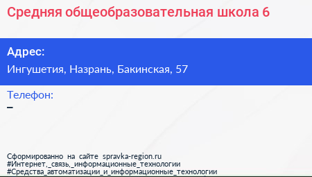 Средняя общеобразовательная школа №6 по адресу Ингушетия, Назрань, Бакинская, 57 в дальнейшем Организация, размещена в следующих категориях: