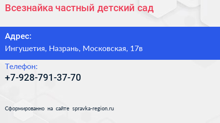 Всезнайка, частный детский сад по адресу Ингушетия, Назрань, Московская, 17в в дальнейшем Организация, размещена в следующих категориях: