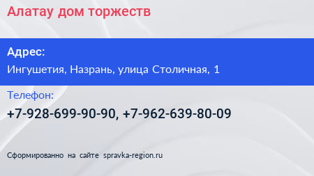 Алатау, дом торжеств по адресу Ингушетия, Назрань, улица Столичная, 1 в дальнейшем Организация, размещена в следующих категориях: