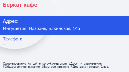 Беркат, кафе по адресу Ингушетия, Назрань, Бакинская, 14а в дальнейшем Организация, размещена в следующих категориях: