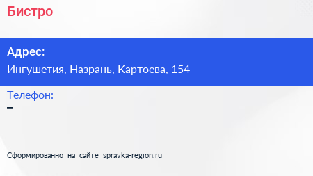 Бистро по адресу Ингушетия, Назрань, Картоева, 154 в дальнейшем Организация, размещена в следующих категориях: