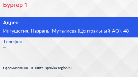 Бургер №1 по адресу Ингушетия, Назрань, Муталиева (Центральный АО), 48 в дальнейшем Организация, размещена в следующих категориях: