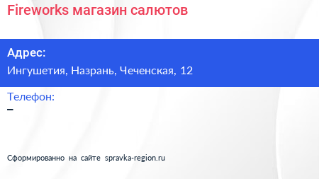 Fireworks, магазин салютов по адресу Ингушетия, Назрань, Чеченская, 12 в дальнейшем Организация, размещена в следующих категориях: