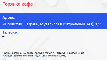 Горянка, кафе по адресу Ингушетия, Назрань, Муталиева (Центральный АО), 1/2 в дальнейшем Организация, размещена в следующих категориях: