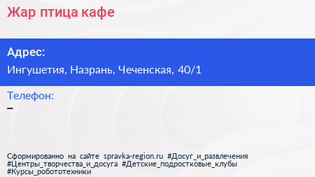 Жар птица, кафе по адресу Ингушетия, Назрань, Чеченская, 40/1 в дальнейшем Организация, размещена в следующих категориях: