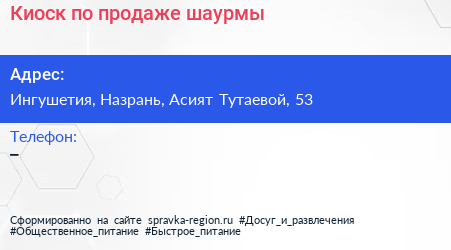 Киоск по продаже шаурмы по адресу Ингушетия, Назрань, Асият Тутаевой, 53 в дальнейшем Организация, размещена в следующих категориях: