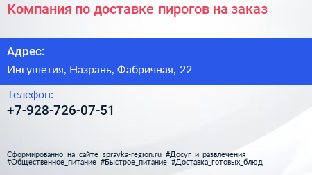 Компания по доставке пирогов на заказ по адресу Ингушетия, Назрань, Фабричная, 22 в дальнейшем Организация, размещена в следующих категориях:
