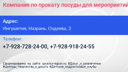Компания по прокату посуды для мероприятий по адресу Ингушетия, Назрань, Оздоева, 2 в дальнейшем Организация, размещена в следующих категориях: