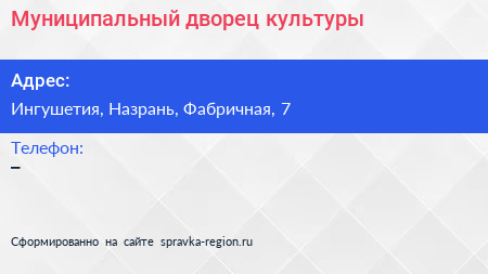 Муниципальный дворец культуры по адресу Ингушетия, Назрань, Фабричная, 7 в дальнейшем Организация, размещена в следующих категориях: