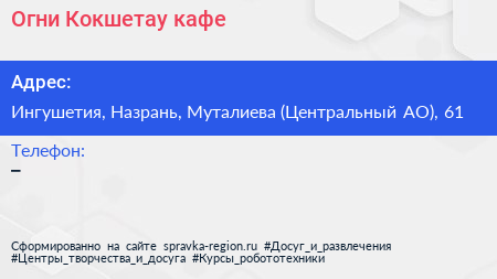 Огни Кокшетау, кафе по адресу Ингушетия, Назрань, Муталиева (Центральный АО), 61 в дальнейшем Организация, размещена в следующих категориях: