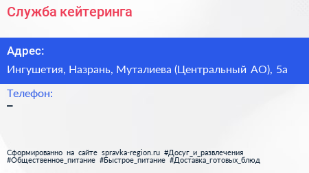 Служба кейтеринга по адресу Ингушетия, Назрань, Муталиева (Центральный АО), 5а в дальнейшем Организация, размещена в следующих категориях: