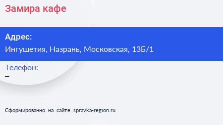 Замира, кафе по адресу Ингушетия, Назрань, Московская, 13Б/1 в дальнейшем Организация, размещена в следующих категориях: