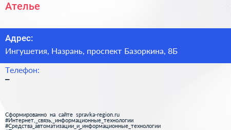 Ателье по адресу Ингушетия, Назрань, проспект Базоркина, 8Б в дальнейшем Организация, размещена в следующих категориях: