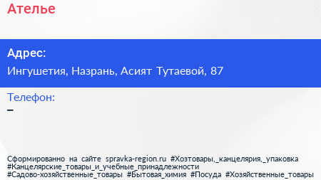 Ателье по адресу Ингушетия, Назрань, Асият Тутаевой, 87 в дальнейшем Организация, размещена в следующих категориях:
