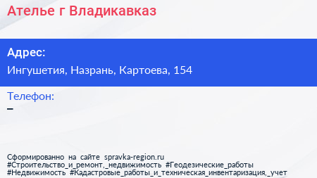 Ателье, г. Владикавказ по адресу Ингушетия, Назрань, Картоева, 154 в дальнейшем Организация, размещена в следующих категориях: