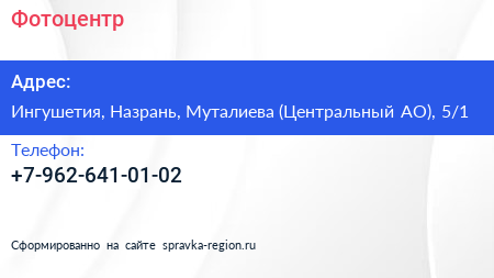Фотоцентр по адресу Ингушетия, Назрань, Муталиева (Центральный АО), 5/1 в дальнейшем Организация, размещена в следующих категориях: