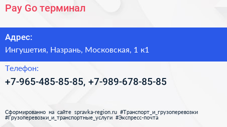 Pay & Go, терминал по адресу Ингушетия, Назрань, Московская, 1 к1 в дальнейшем Организация, размещена в следующих категориях: