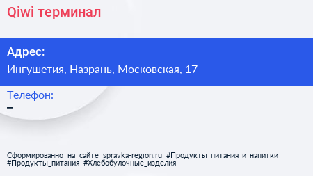Qiwi, терминал по адресу Ингушетия, Назрань, Московская, 17 в дальнейшем Организация, размещена в следующих категориях: