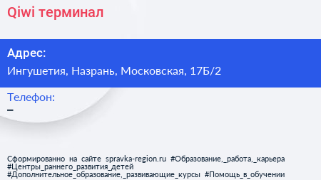 Qiwi, терминал по адресу Ингушетия, Назрань, Московская, 17Б/2 в дальнейшем Организация, размещена в следующих категориях: