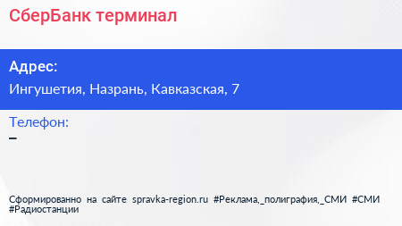 СберБанк, терминал по адресу Ингушетия, Назрань, Кавказская, 7 в дальнейшем Организация, размещена в следующих категориях: