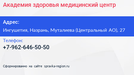 Академия здоровья, медицинский центр по адресу Ингушетия, Назрань, Муталиева (Центральный АО), 27 в дальнейшем Организация, размещена в следующих категориях:
