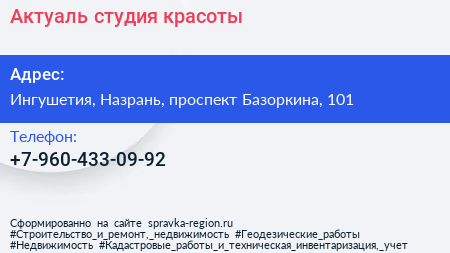 Актуаль, студия красоты по адресу Ингушетия, Назрань, проспект Базоркина, 101 в дальнейшем Организация, размещена в следующих категориях:
