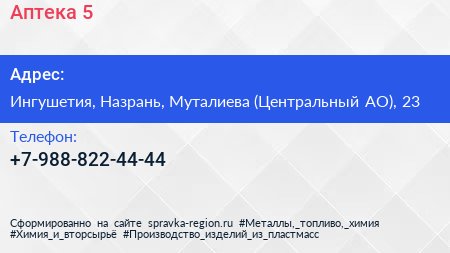 Аптека №5 по адресу Ингушетия, Назрань, Муталиева (Центральный АО), 23 в дальнейшем Организация, размещена в следующих категориях: